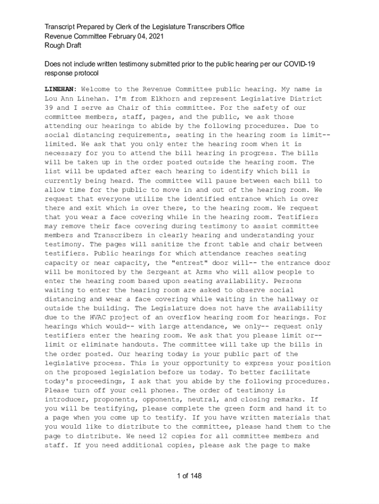 TranscriptPreparedbyClerkoftheLegislatureTranscribersOffice RevenueCommitteeFebruary04,2021 Roughcast DoesnotincludewrittentestimonysubmittedpriortothepublichearingperourCOVID19 response protocol