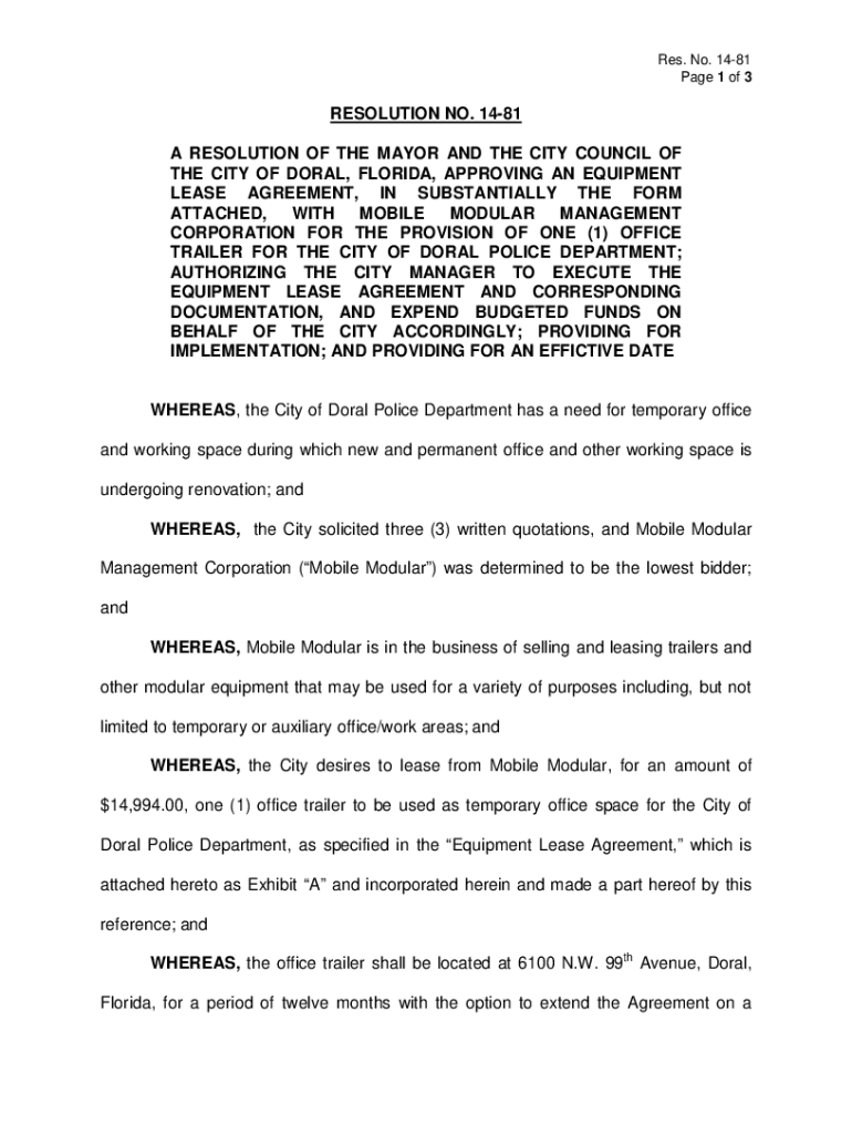 Res. No. 1481-Page 1 of 3RESOLUTION NO. 1481 A RESOLUTION OF THE MAYOR AND THE CITY COUNCIL OF THE CITY OF, FLORIDA, APPROVING AN EQUIPMENT LEASE AGREEMENT, IN SUBSTANTIALLY THE FORM ATTACHED, WITH