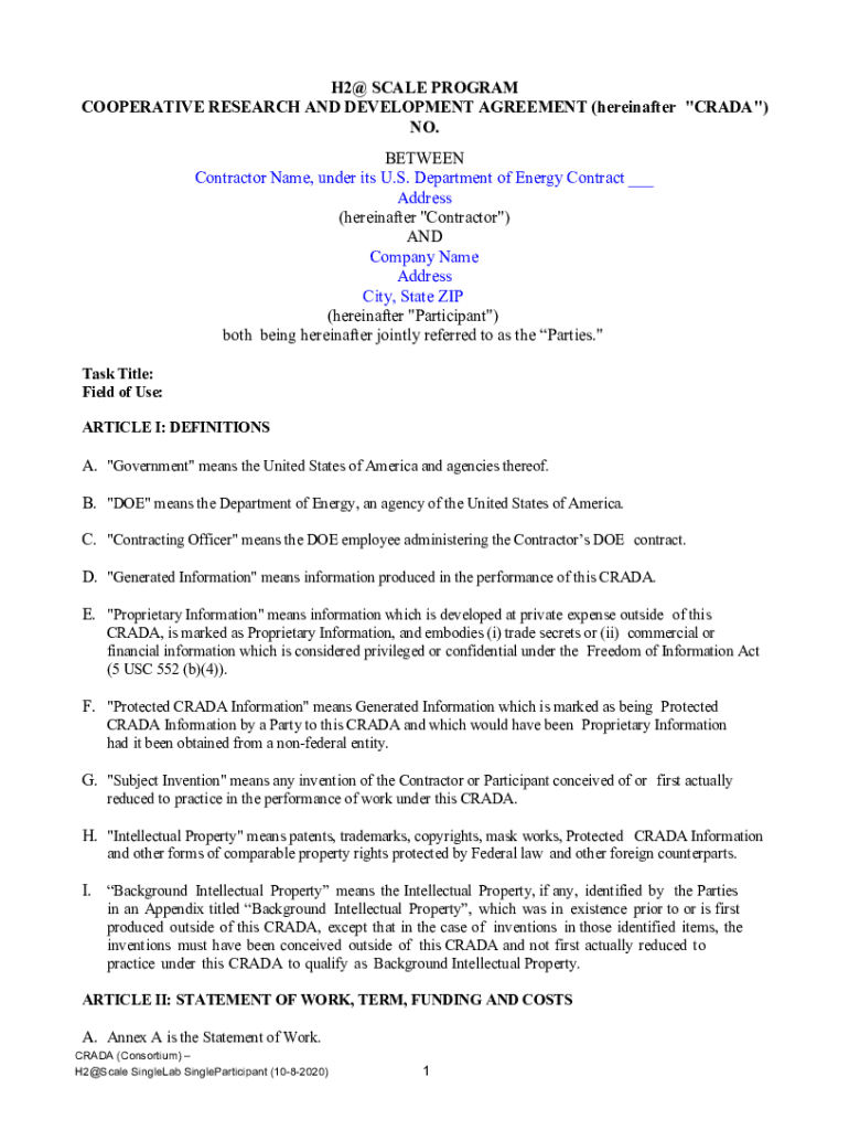 H2@ SCALE PROGRAM COOPERATIVE RESEARCH AND DEVELOPMENT AGREEMENT (hereinafter \” PRADA\”) NO. BETWEEN Contractor Name, under its U.S. Department of Energy Contract ___ Address (hereinafter \”