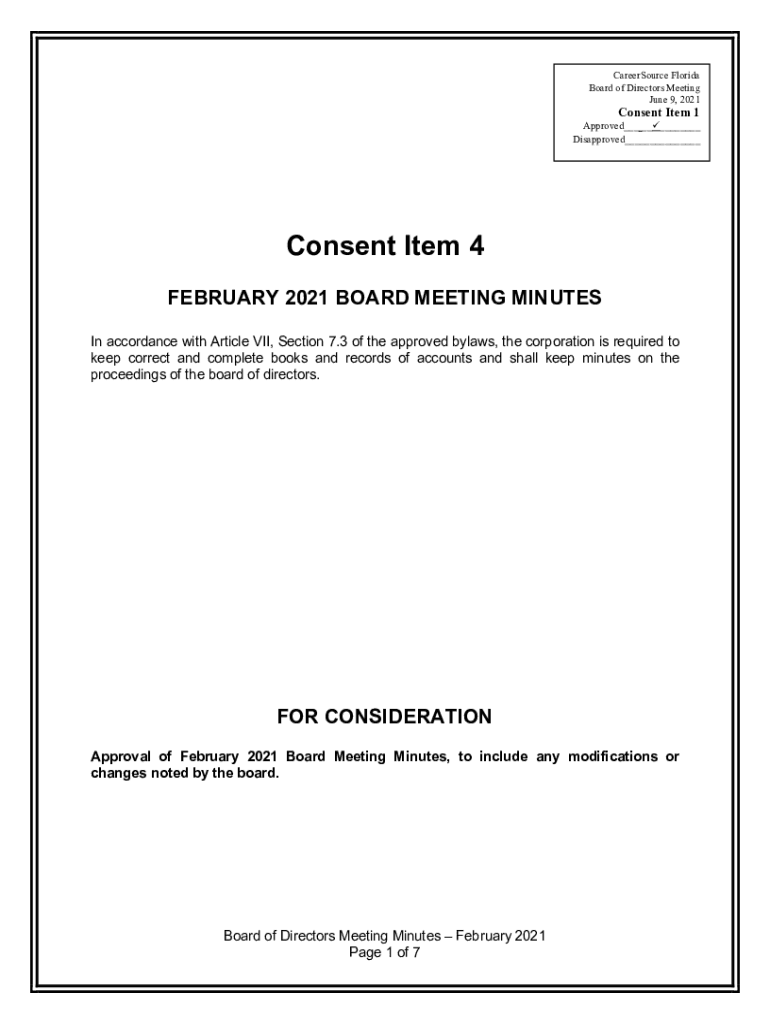 CareerSource Florida Board of Directors Meeting June 9, 2021Consent Item 1Approved___ _____ Disapproved___Consent Item 4 FEBRUARY 2021 BOARD MEETING MINUTES In accordance with Article VII, Section