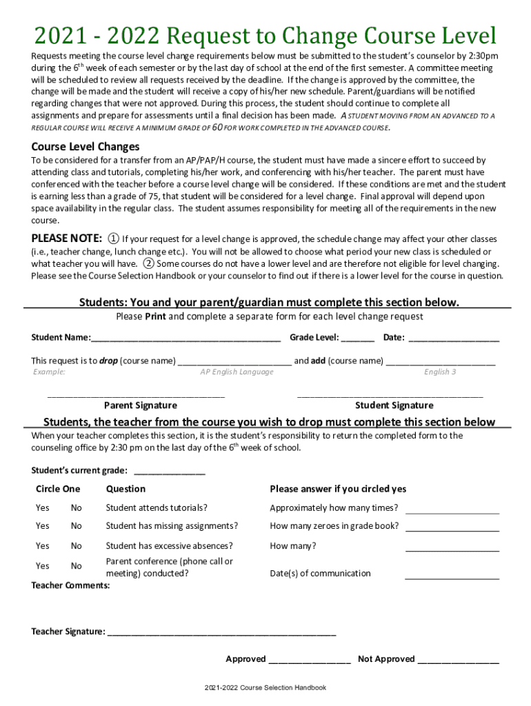 2021 2022 Request to Change Course Level Requestsmeetingthecourselevelchangerequirementsbelowmustbesubmittedtothestudentscounselorby2:30pm duringthe6thweekofeachsemesterorbythelastdayofschoolattheendofthefirstsemester.