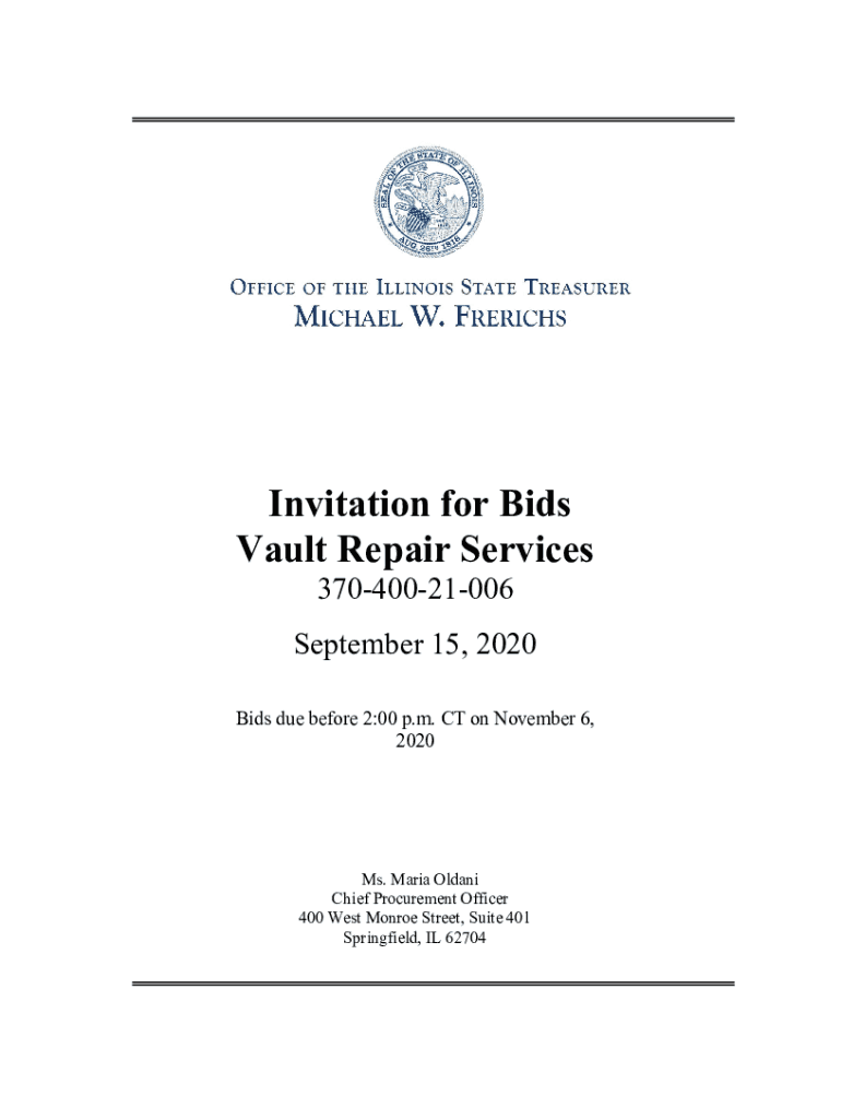 Invitation for Bids Vault Repair Services 37040021006September 15, 2020 Bids due before 2:00 p.m. CT on November 6, 2020Ms. Maria Olden Chief Procurement Officer 400 West Monroe Street, Suite 401