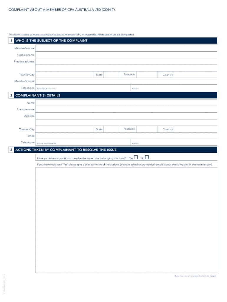 Get the free Complaint Form - CPA AustraliaMember conduct and disciplineCPA AustraliaMaking a com...