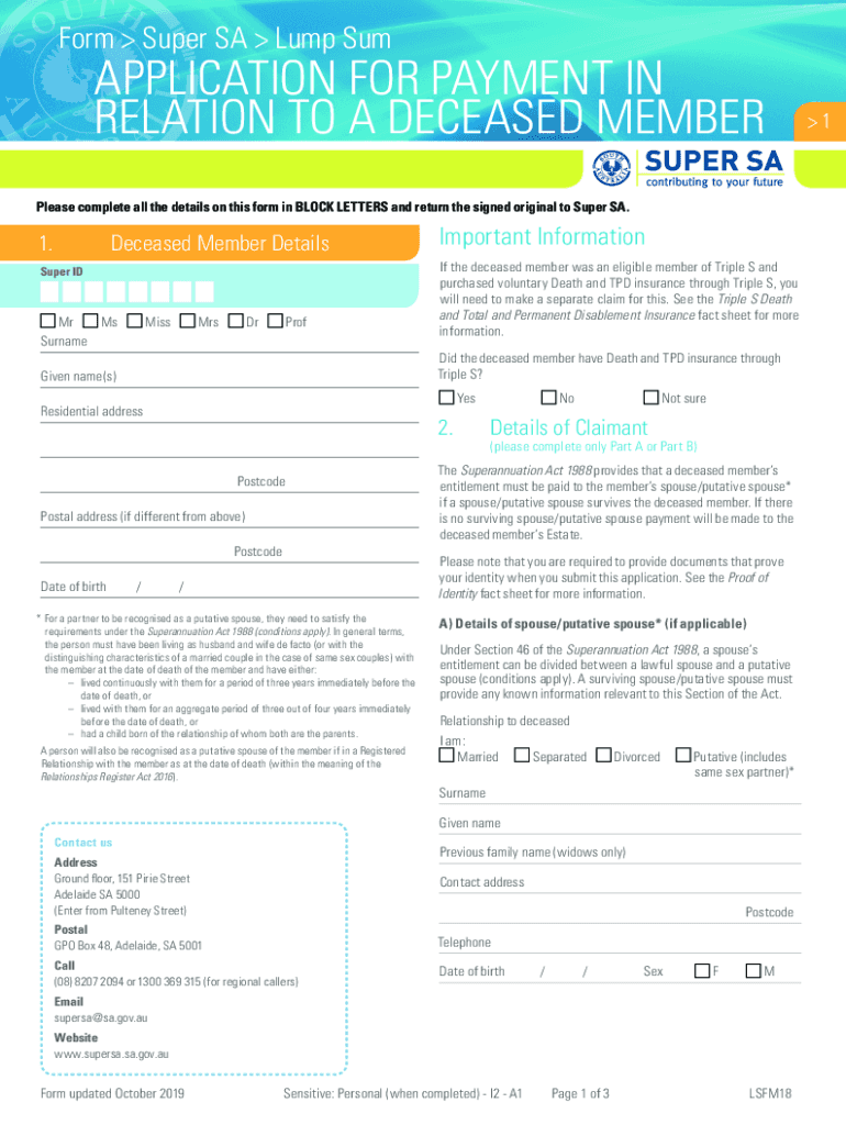Form Supers Lump SumSUPERANNUANTSAPPLICATION FOR PAYMENT IN RELATION TO A DECEASED MEMBERPlease complete all the details on this form in BLOCK LETTERS and return the signed original to Supers.1. Deceased