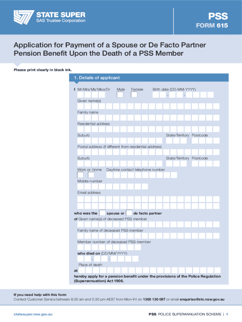 PSS FORM 615Application for Payment of a Spouse or DE Fact Partner Pension Benefit Upon the Death of a PSS Member Please print clearly in black ink.1. Details of applicant Mr/Mrs/Ms/Miss/DrMaleFemaleBirth
