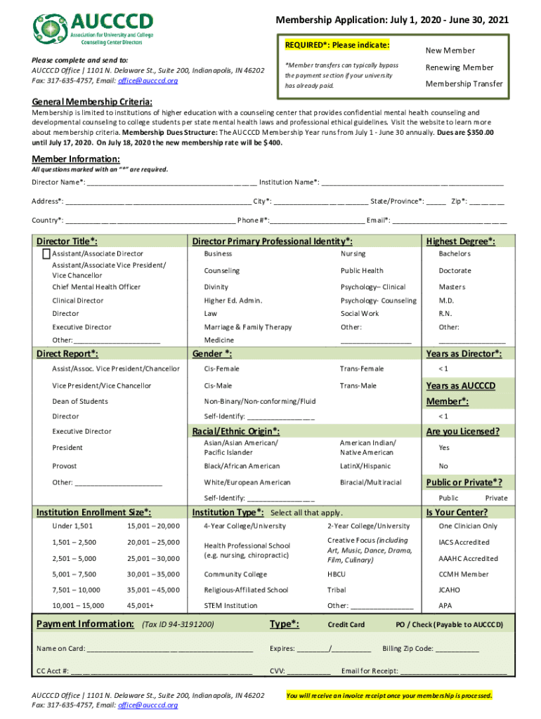Membership Application: July 1, 2020, June 30, 2021, REQUIRED*: Please indicate: Please complete and send to: AUC CCD Office | 1101 N. Delaware St., Suite 200, Indianapolis, IN 46202 Fax: 3176354757,