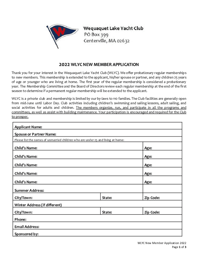 2022 WAY NEW MEMBER APPLICATION Thank you for your interest in the Wequaquet Lake Yacht Club (WAY). We offer probationary regular memberships to new members. This membership is extended to the applicant,