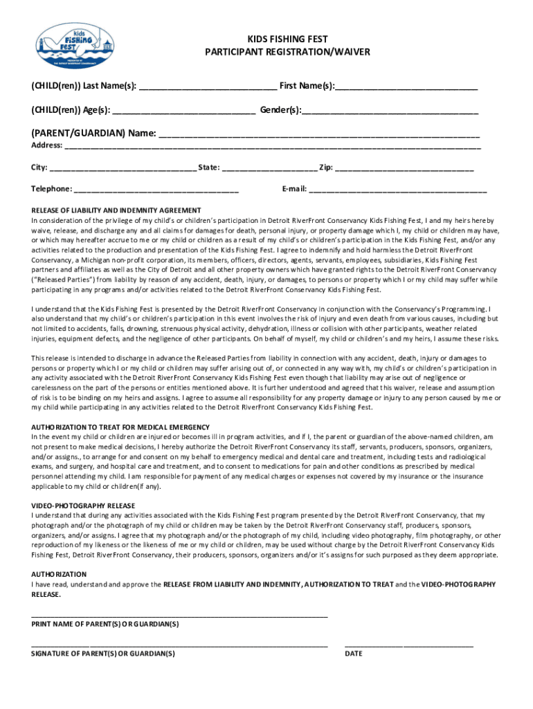 KIDS FISHING FEST PARTICIPANT REGISTRATION/WAIVER (CHILD(men)) Last Name(s): ___ First Name(s):___ (CHILD(men)) Age(s): ___ Gender(s):___(PARENT/GUARDIAN) Name: ___ Address: ___ City: ___ State: ___