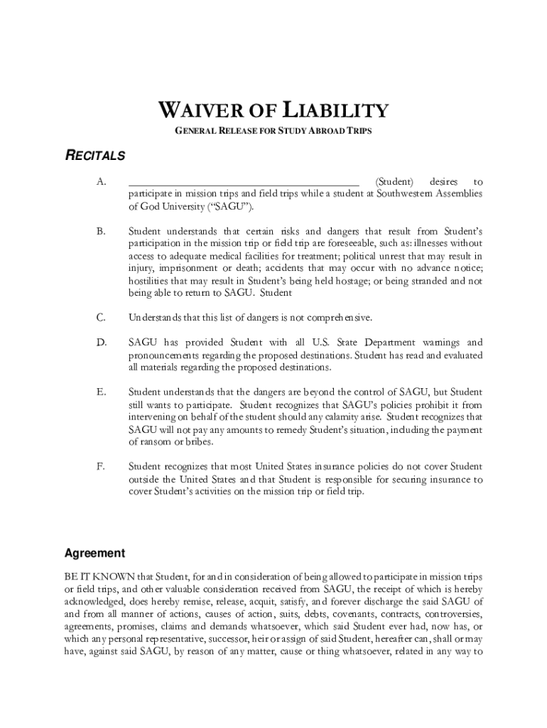 WAIVER OF LIABILITY GENERAL RELEASE FOR STUDY ABROAD TRIPSRECITALS A.___ (Student) desires to participate in mission trips and field trips while a student at Southwestern Assemblies of God University