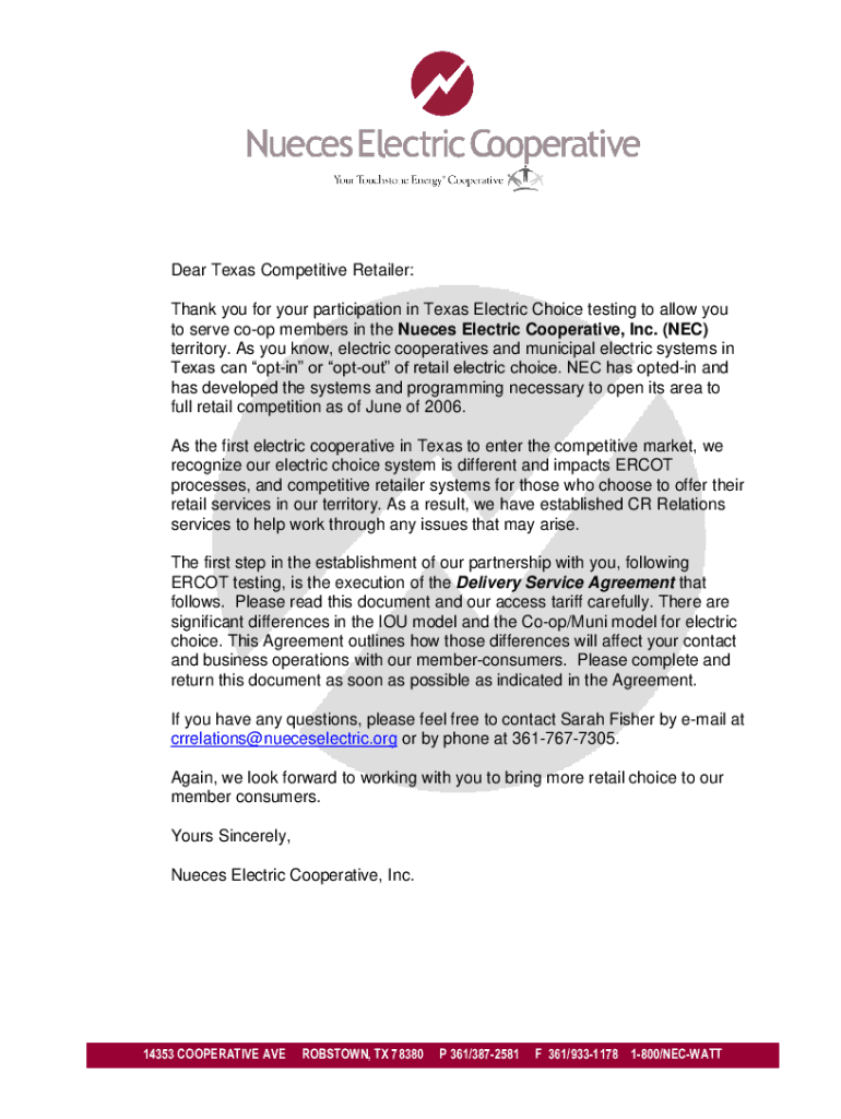 Dear Texas Competitive Retailer: Thank you for your participation in Texas Electric Choice testing to allow you to serve coop members in the Nieces Electric Cooperative, Inc. (NEC) territory. As you