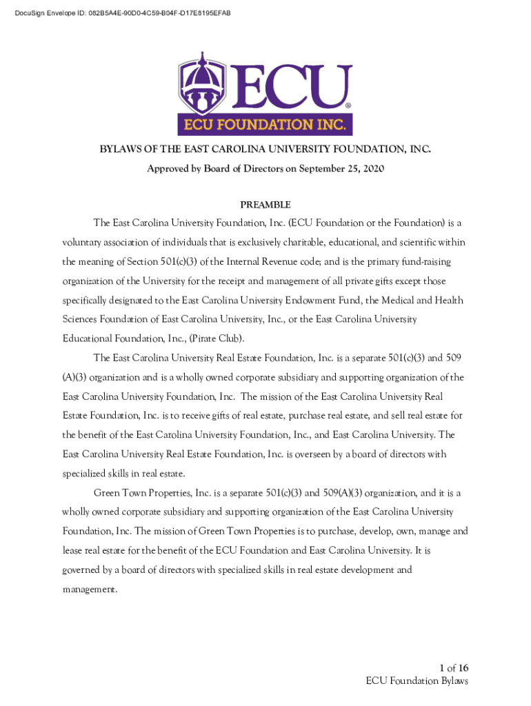DocuSign Envelope ID: 082B5A4E90D04C59B04FD17E8195EFABBYLAWS OF THE EAST CAROLINA UNIVERSITY FOUNDATION, INC. Approved by Board of Directors on September 25, 2020, Preamble East Carolina University