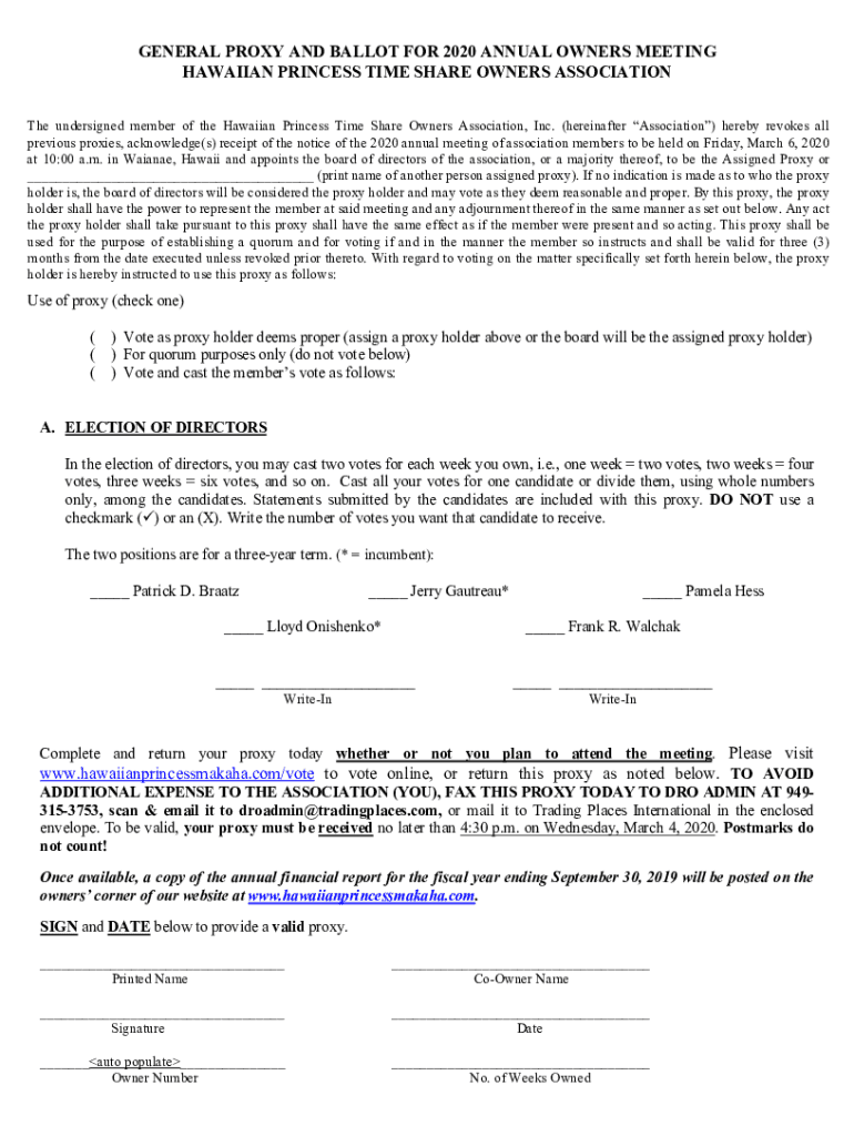 GENERAL PROXY AND BALLOT FOR 2020 ANNUAL OWNERS MEETING HAWAIIAN PRINCESS TIME SHARE OWNERS ASSOCIATION The undersigned member of the Hawaiian Princess Time Share Owners Association, Inc. (hereinafter
