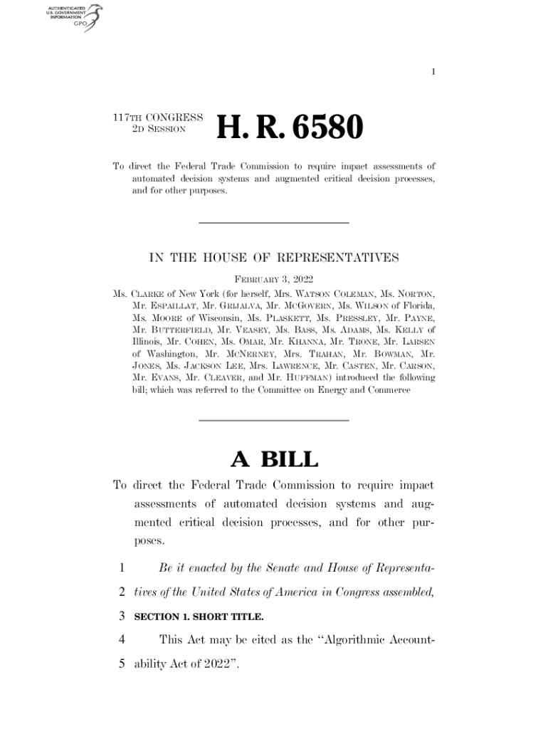 I117TH CONGRESS 2D SESSION. R. 6580To direct the Federal Trade Commission to require impact assessments of automated decision systems and augmented critical decision processes, and for other purposes.IN