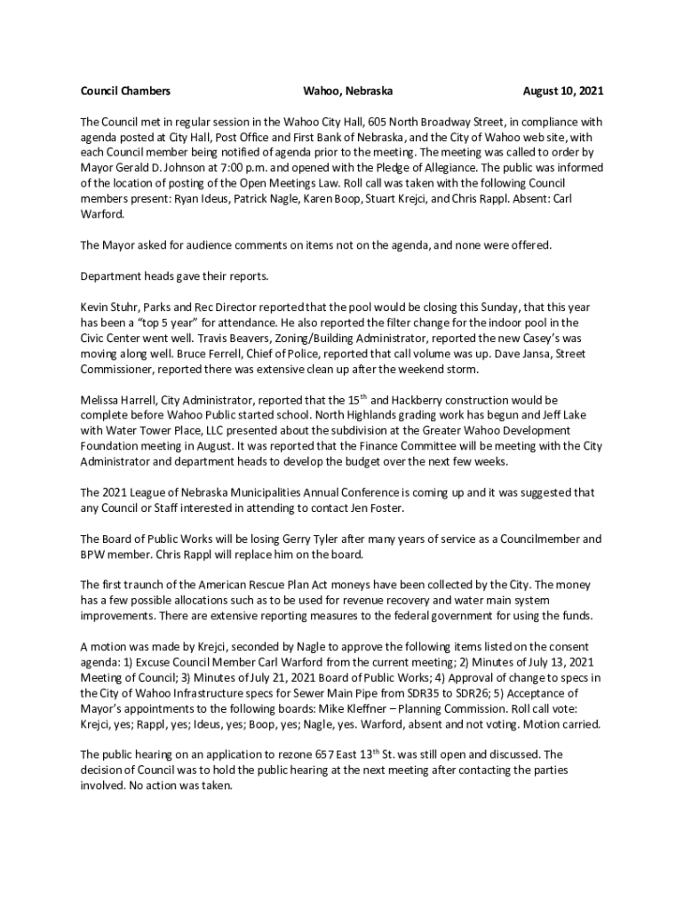 Council ChambersWahoo, Nebraska August 10, 2021The Council met in regular session in the Yahoo City Hall, 605 North Broadway Street, in compliance with agenda posted at City Hall, Post Office and