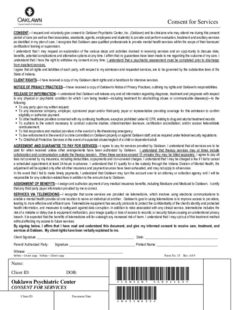 Consent for Services CONSENT request and voluntarily give consent to Oak lawn Psychiatric Center, Inc. (Oak lawn) and its clinicians who may attend me during this present period of care (as well as