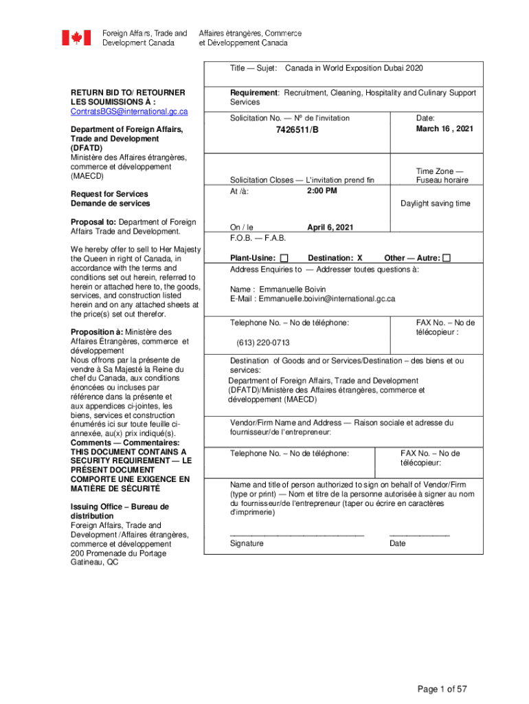 Title Suet: RETURN BID TO/ RETURNER LES COMMISSIONS : Contrasts×international.GC.ca Department of Foreign Affairs, Trade and Development (DFA TD) Minister DES Affairs ranges, commerce ET development
