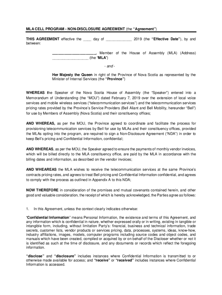 MLA CELL PROGRAM NONDISCLOSURE AGREEMENT (the Agreement) THIS AGREEMENT effective the ___ day of ___ 2019 (the Effective Date), by and between:___, Member of the House of Assembly (MLA) (Address)