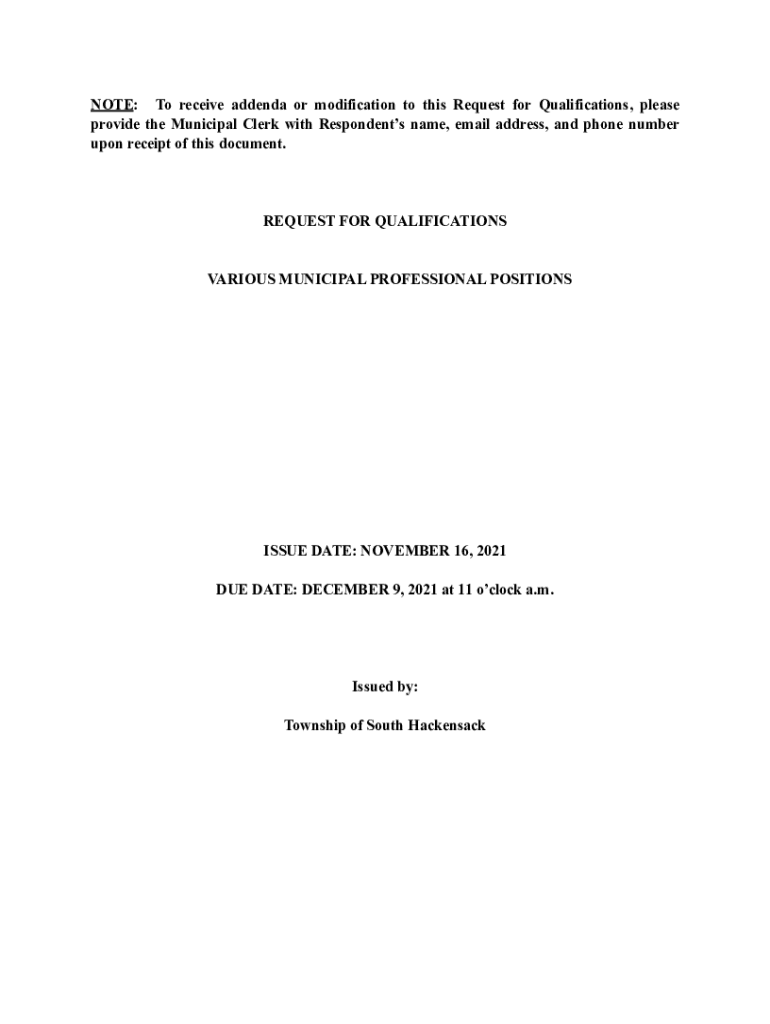 REQUEST FOR QUALIFICATIONSVARIOUS MUNICIPAL PROFESSIONAL POSITIONSISSUE DATE: NOVEMBER 16, 2021, DUE DATE: DECEMBER 9, 2021, at 11 o'clock. Issued by:Township of South HackensackNOTE: To receive addenda