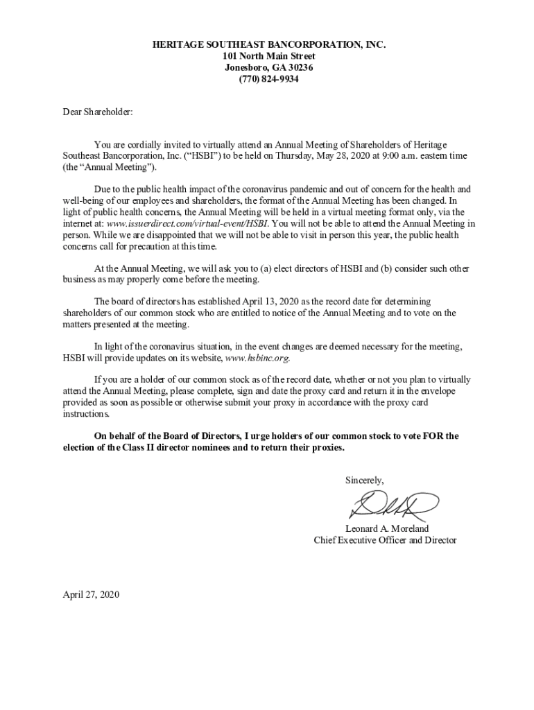HERITAGE SOUTHEAST INCORPORATION, INC. 101 North Main Street Jonesboro, GA 30236 (770) 8249934 Dear Shareholder: You are cordially invited to virtually attend an Annual Meeting of Shareholders of