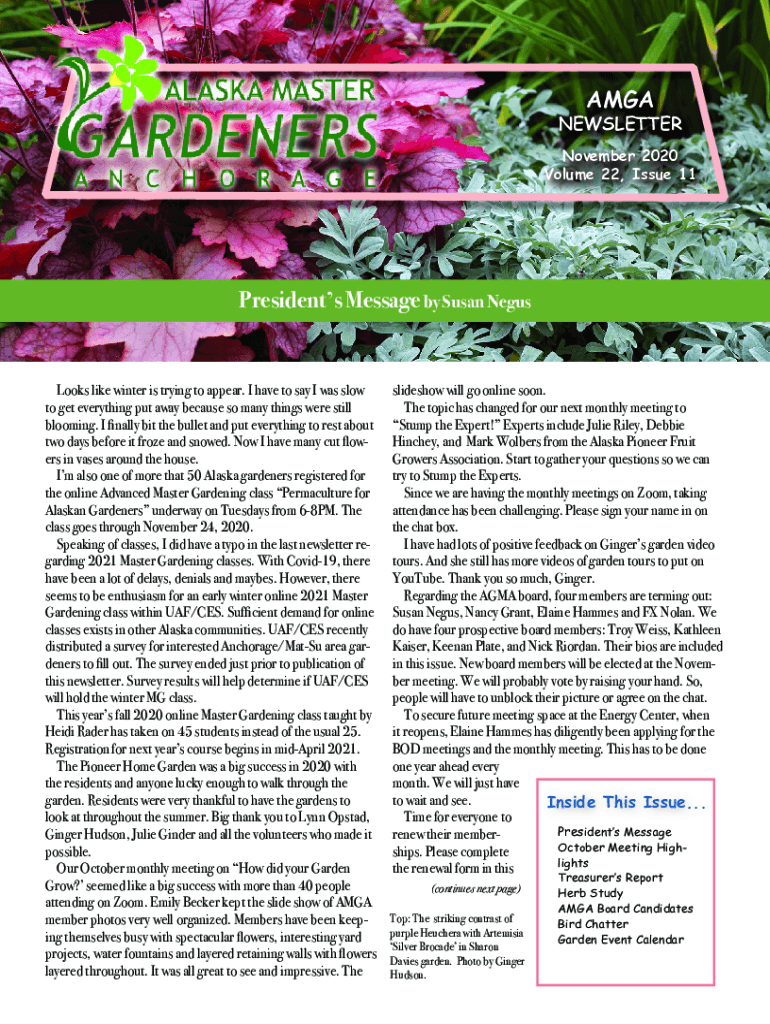 AMGANEWSLETTER November 2020 Volume 22, Issue 11Presidents Message by Susan NegusLooks like winter is trying to appear. I have to say I was slow to get everything put away because so many things were