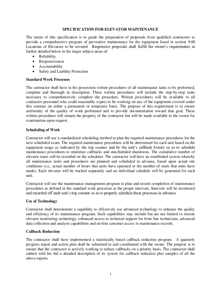 SPECIFICATION FOR ELEVATOR MAINTENANCE The intent of this specification is to guide the preparation of proposals from qualified contractors to provide a comprehensive program of preventive maintenance