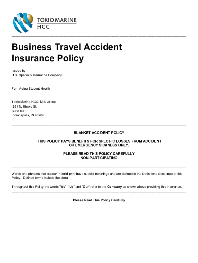 ___Business Travel Accident Insurance Policy Issued by: U.S. Specialty Insurance Company: Aetna Student HealthTokio Marine HCC: MIS Group 251 N. Illinois St. Suite 600 Indianapolis, IN 46204 ___BLANKET