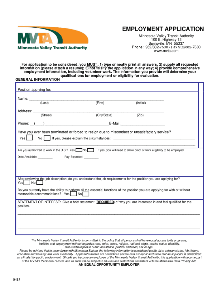 EMPLOYMENT APPLICATION Minnesota Valley Transit Authority 100 E. Highway 13 Barnesville, MN 55337 Phone: 952/8827500 Fax 952/8827600 www.mvta.comFor application to be considered, you MUST: 1) type