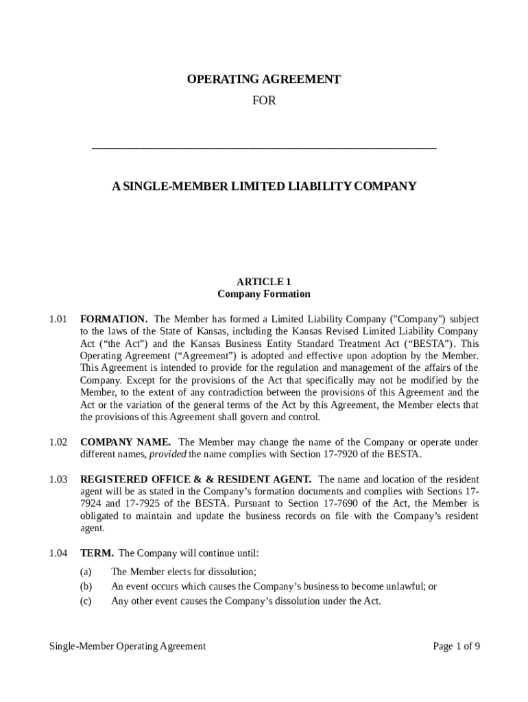 OPERATING AGREEMENT FOR ___ A SINGLEMEMBER LIMITED LIABILITY COMPANYARTICLE 1 Company Formation 1.01FORMATION. The Member has formed a Limited Liability Company (\” Company\”) subject to the laws