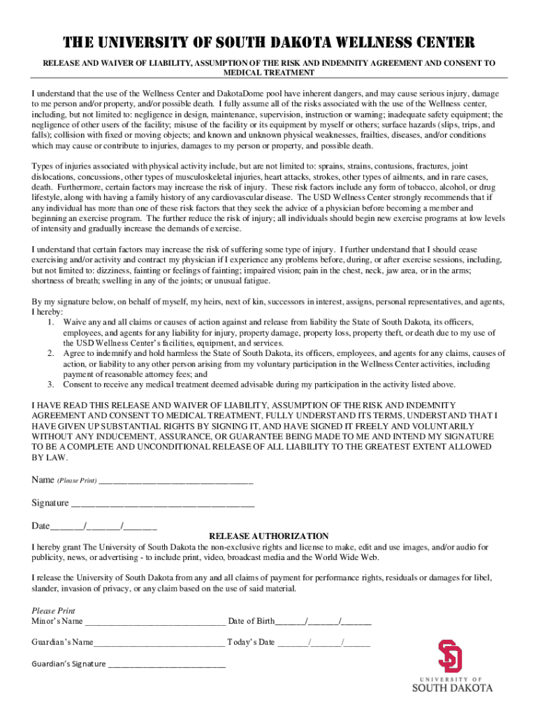 The University of South Dakota Wellness Center RELEASE AND WAIVER OF LIABILITY, ASSUMPTION OF THE RISK AND INDEMNITY AGREEMENT AND CONSENT TO MEDICAL TREATMENT understand that the use of the Wellness