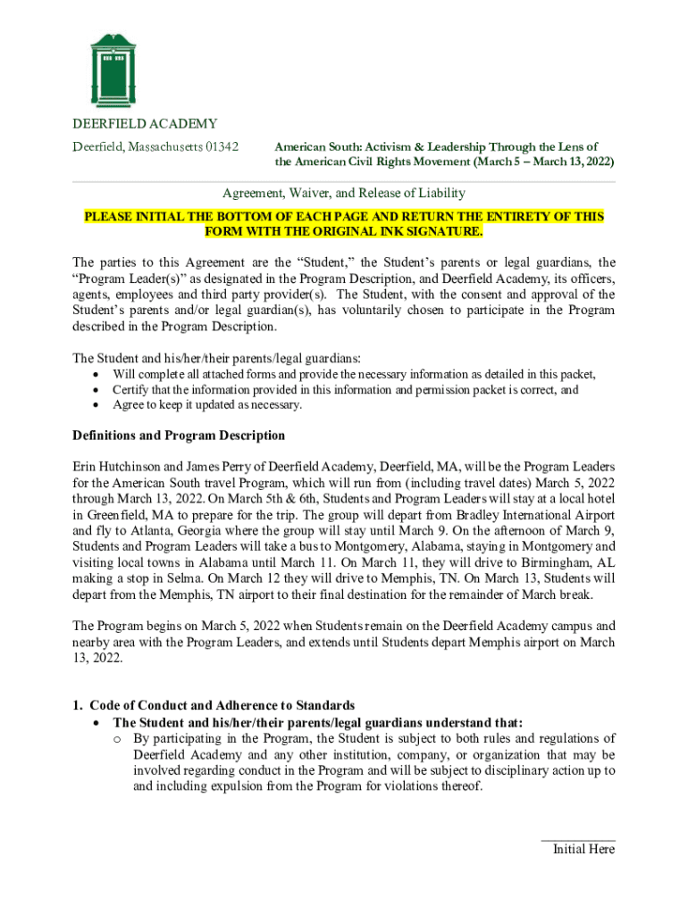 DEERFIELD ACADEMY Deerfield, Massachusetts 01342American South: Activism & Leadership Through the Lens of the American Civil Rights Movement (March 5 March 13, 2022)Agreement, Waiver, and Release