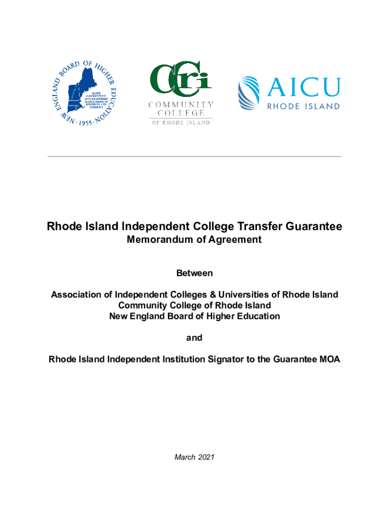 Rhode Island Independent College Transfer Guarantee Memorandum of Agreement Between Association of Independent Colleges & Universities of Rhode Island Community College of Rhode Island New England
