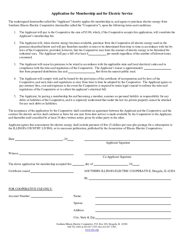 Application for Membership and for Electric Service The undersigned (hereinafter called the Applicant) hereby applies for membership in, and agrees to purchase electric energy from Southern Illinois