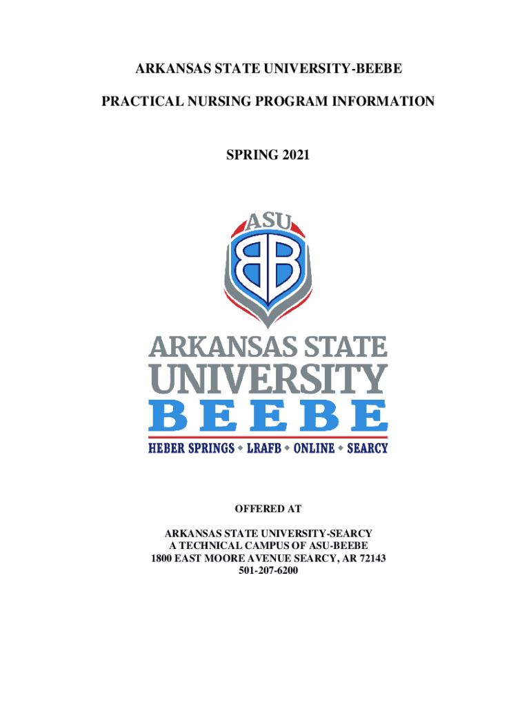 ARKANSAS STATE UNIVERSITYBEEBE PRACTICAL NURSING PROGRAM INFORMATIONSPRING 2021OFFERED AT ARKANSAS STATE UNIVERSITYSEARCY A TECHNICAL CAMPUS OF BEEBE 1800 EAST MOORE AVENUE SEARCH, AR 72143 5012076200TABLE