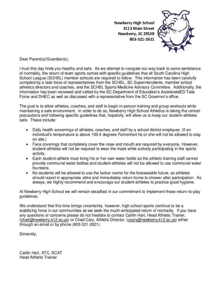Newberry High School 3113 Main Street Newberry, SC 29108 8033212621Dear Parent(s)/Guardian(s), I trust this day finds you healthy and safe. As we attempt to navigate our way back to some semblance