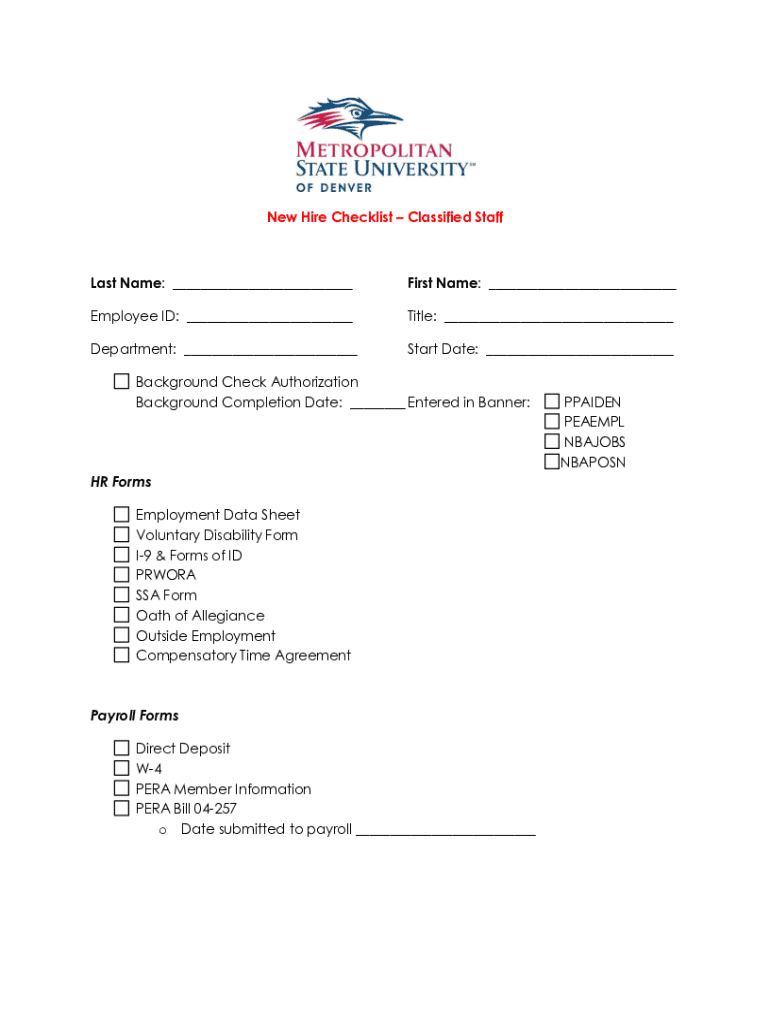 Get the free New Hire Checklist First Name: PEAEMPL NBAJOBS NBAPOSN HR Forms - msudenver.edu