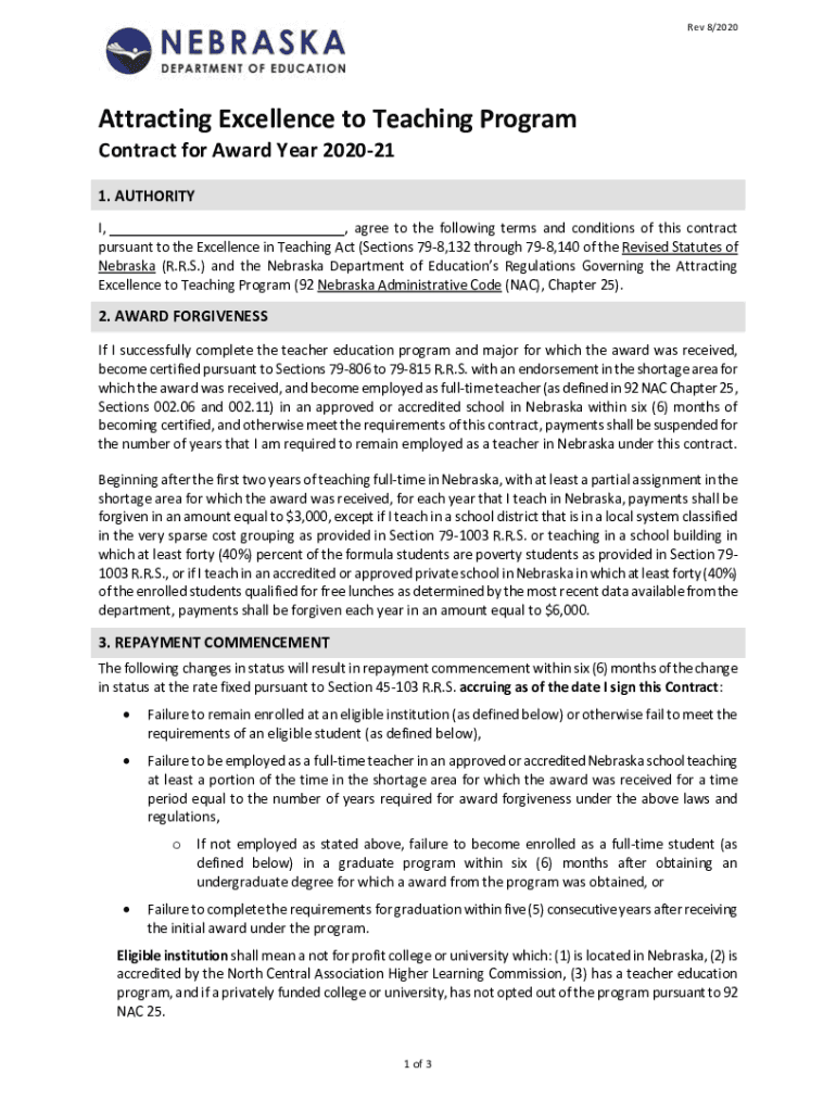 Rev 8/2020Attracting Excellence to Teaching Program Contract for Award Year 202021 1. AUTHORITY I, agree to the following terms and conditions of this contract pursuant to the Excellence in Teaching