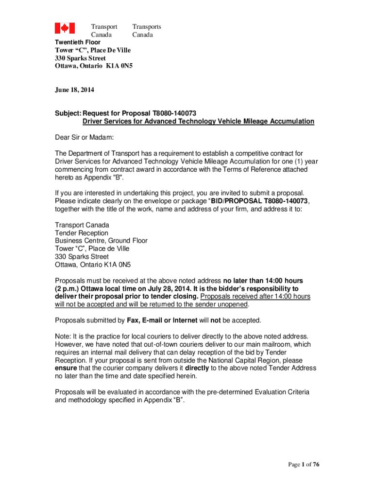 Transport CanadaTransports CanadaTwentieth FloorTower C, Place De Ville 330 Sparks Street Ottawa, Ontario K1A 0N5June 18, 2014 Subject: Request for Proposal T8080140073 Driver Services for Advanced