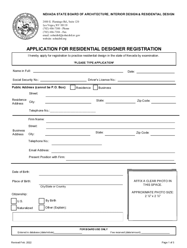 STATE OF NEVADA RESIDENTIAL DESIGN REGISTRATION BY EXAMINATION APPLICATION AND INSTRUCTIONS Following are the instructions and application for residential design registration by examination in the