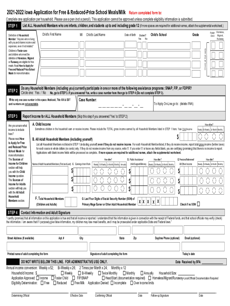 20212022 Iowa Application for Free & Reduced Price School Meals/Milk Return completed form to: Complete one application per household. Please use a pen (not a pencil). This application cannot be approved