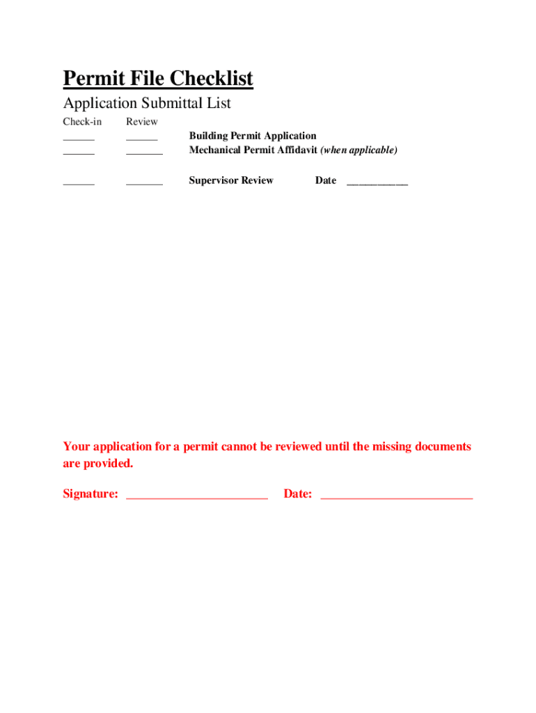 Permit File Checklist Application Submittal List Checking ___ ___Review ___ ___Building Permit Application Mechanical Permit Affidavit (when applicable)______Supervisor Revalidate___Your application