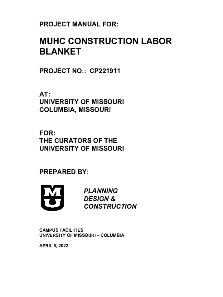 PROJECT MANUAL FOR:MHC CONSTRUCTION LABOR BLANKET PROJECT NO.: CP221911 AT: UNIVERSITY OF MISSOURI COLUMBIA, MISSOURI FOR: THE CURATORS OF THE UNIVERSITY OF MISSOURI PREPARED BY: PLANNING DESIGN &