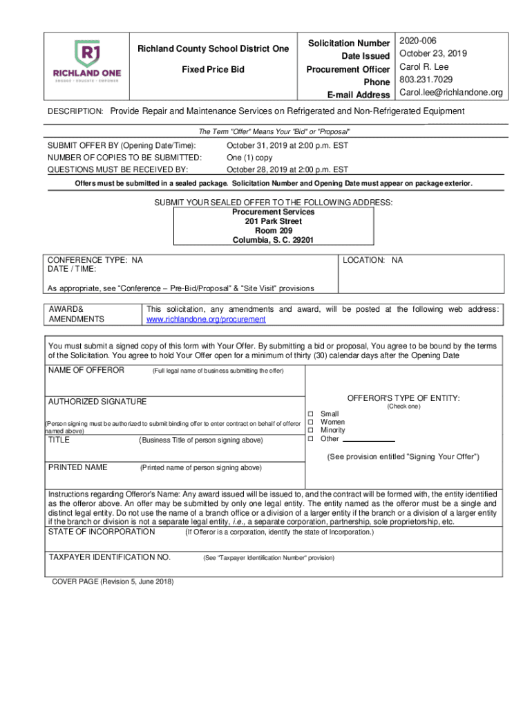 Richland County School District One Fixed Price Solicitation Number Date Issued Procurement Officer Phone Email Address2020006 October 23, 2019, Carol R. Lee 803.231.7029 Carol. Lee×Richland.description: