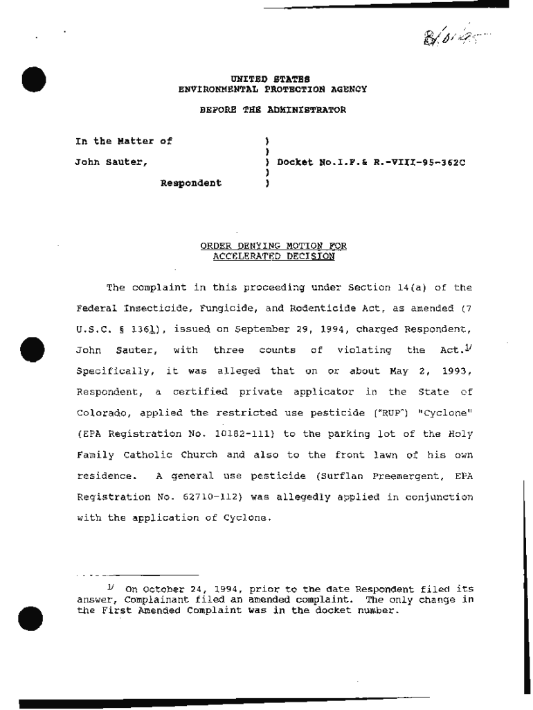 UNITED STATES ENVIRONMENTAL PROTECTION AGENCY BEFORE THE ADMINISTRATOR In the Matter of))John Saucer, ) Docket No. I.F.& R.VIII95362C))RespondentORDER DENYING MOTION FOR ACCELERATED DECISION The complaint