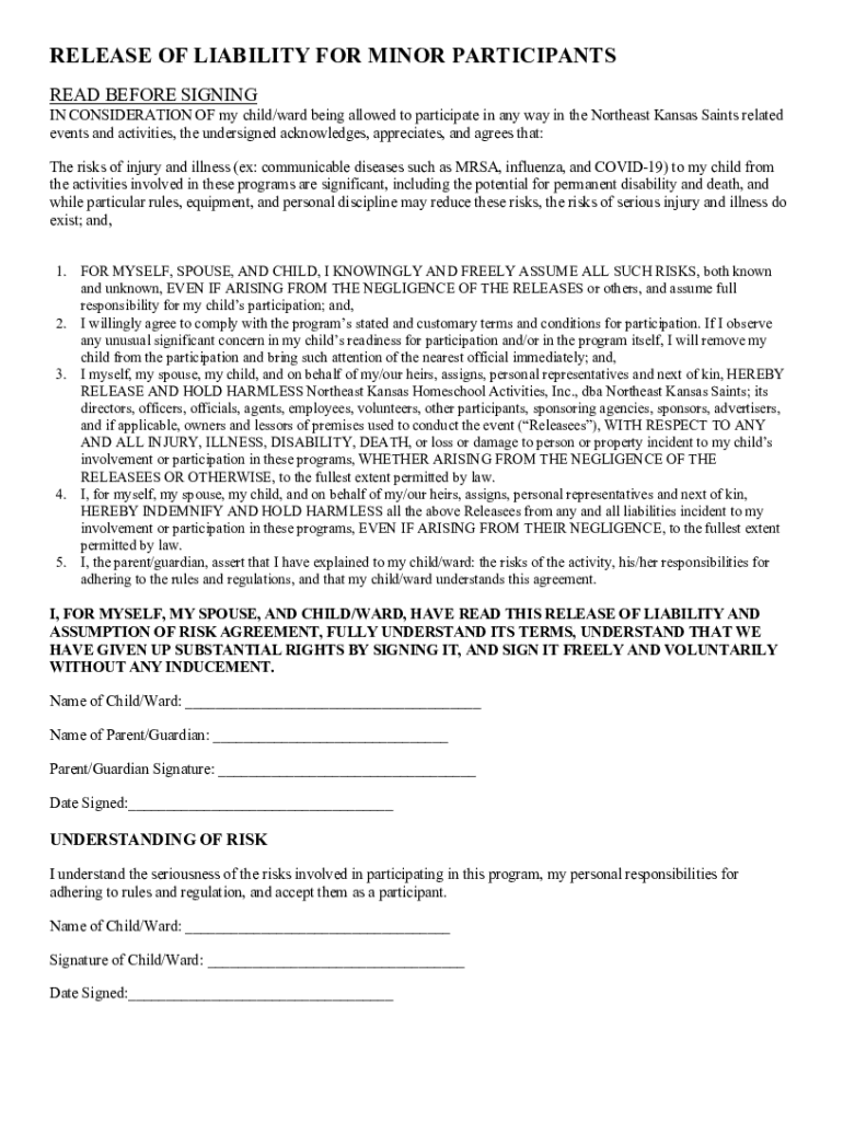 RELEASE OF LIABILITY FOR MINOR PARTICIPANTS READ BEFORE SIGNING IN CONSIDERATION OF my child/ward being allowed to participate in any way in the Northeast Kansas Saints related events and activities,