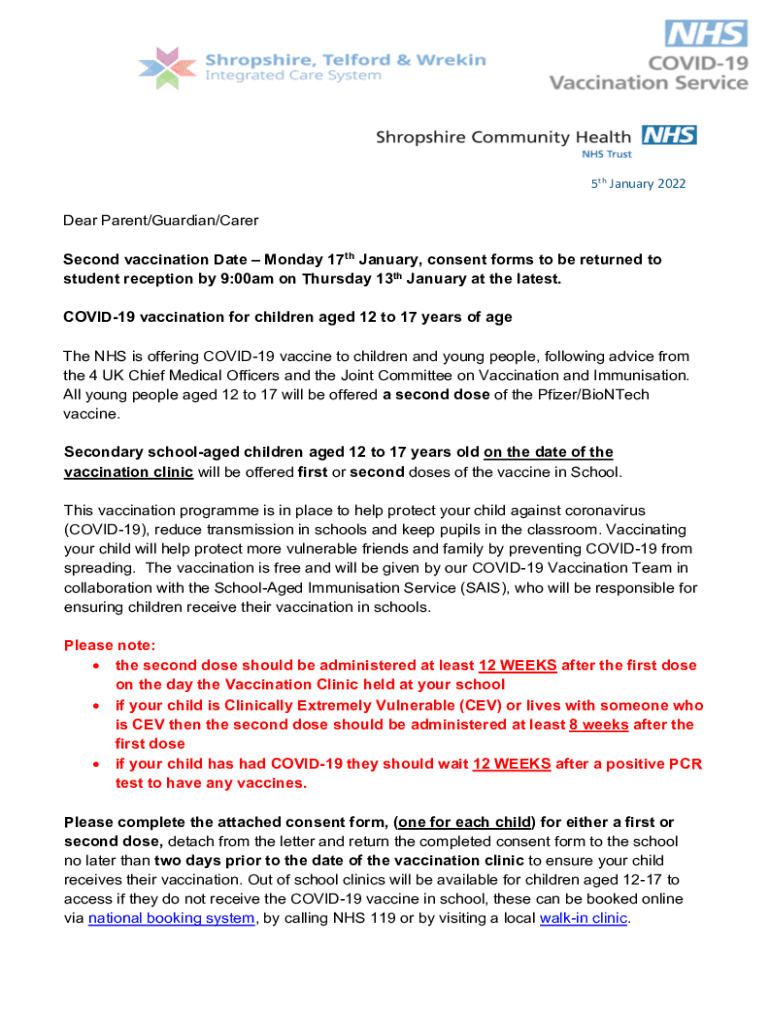 5th January 2022Dear Parent/Guardian/Carer Second vaccination Date Monday 17th January, consent forms to be returned to student reception by 9:00am on Thursday 13th January at the latest. COVID-19