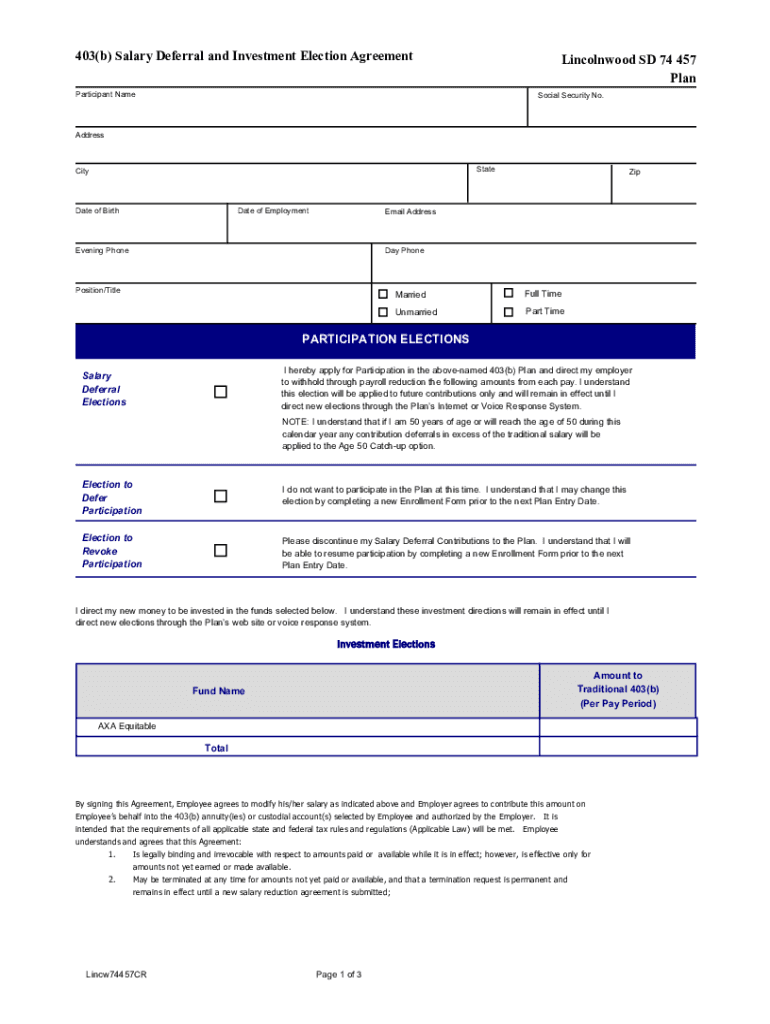 403(b) Salary Deferral and Investment Election AgreementLincolnwood SD 74 457 Nonparticipant Asocial Security No. AddressStateCityDate of BirthDate of EmploymentZipEmail Address Day PhoneEvening Proposition/TitleMarriedFull