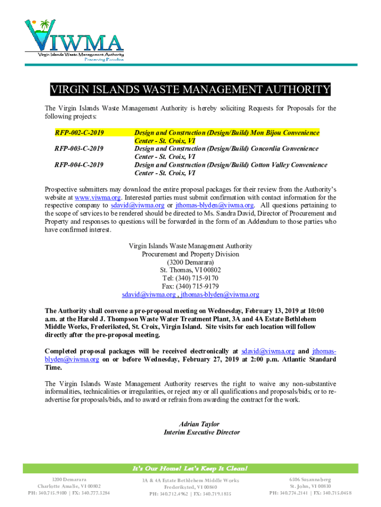 VIRGIN ISLANDS WASTE MANAGEMENT AUTHORITY The Virgin Islands Waste Management Authority is hereby soliciting Requests for Proposals for the following projects: RFP002C2019 RFP003C2019 RFP004C2019Design