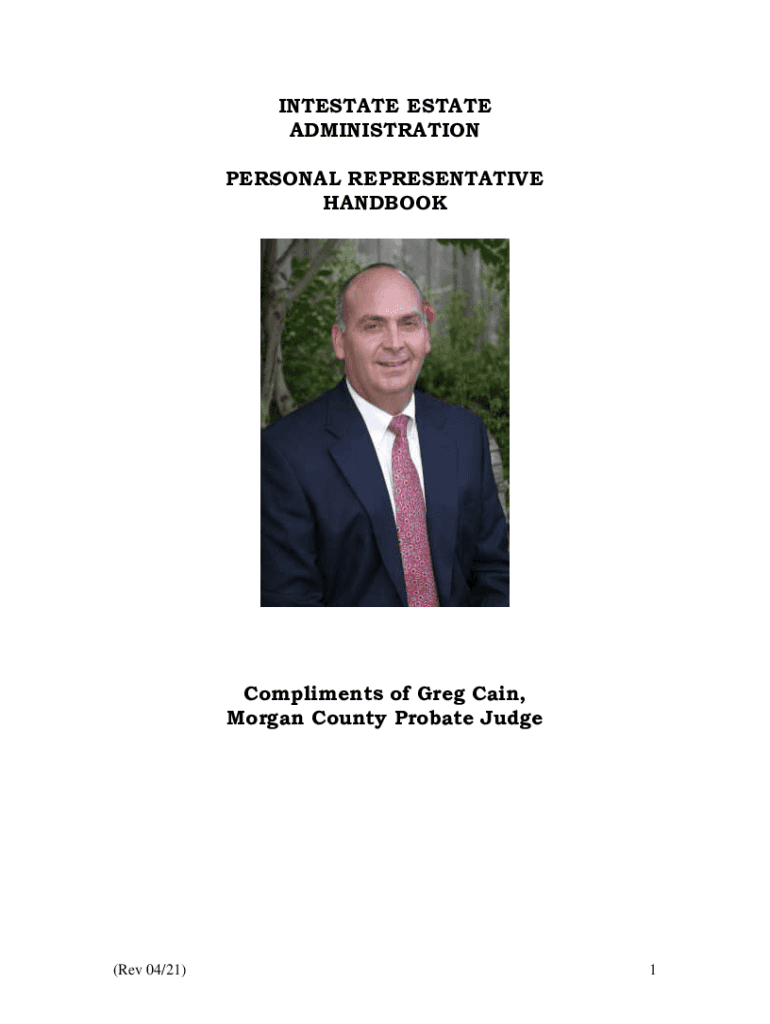 INTESTATE ESTATE ADMINISTRATION PERSONAL REPRESENTATIVE HANDBOOKCompliments of Greg Cain, Morgan County Probate Judge(Rev 04/21)1I. INTRODUCTION Naming the wrong person to administer an Estate can