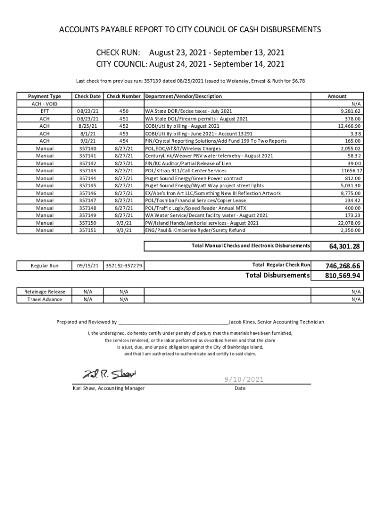 ACCOUNTS PAYABLE REPORT TO CITY COUNCIL OF CASH DISBURSEMENTS CHECK RUN: August 23, 2021, September 13, 2021, CITY COUNCIL: August 24, 2021, September 14, 2021, Last check from previous run: 357139