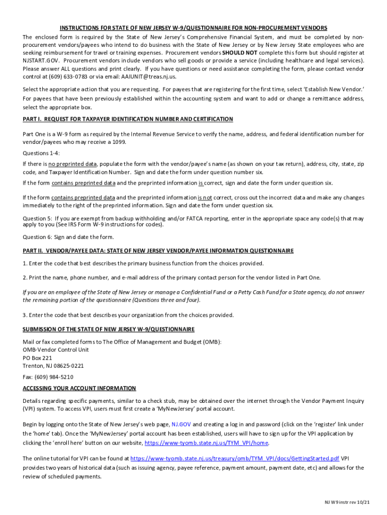 INSTRUCTIONS FOR STATE OF NEW JERSEY W9/QUESTIONNAIRE FOR PROCUREMENT VENDORS The enclosed form is required by the State of New Jerseys Comprehensive Financial System, and must be completed by nonprocurement
